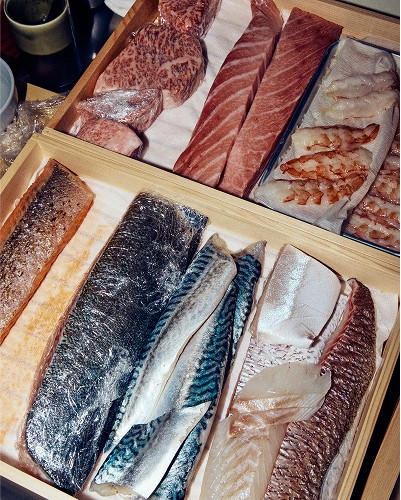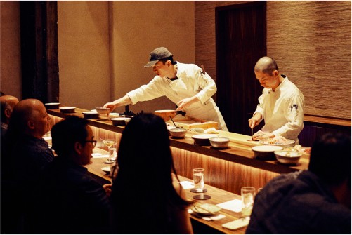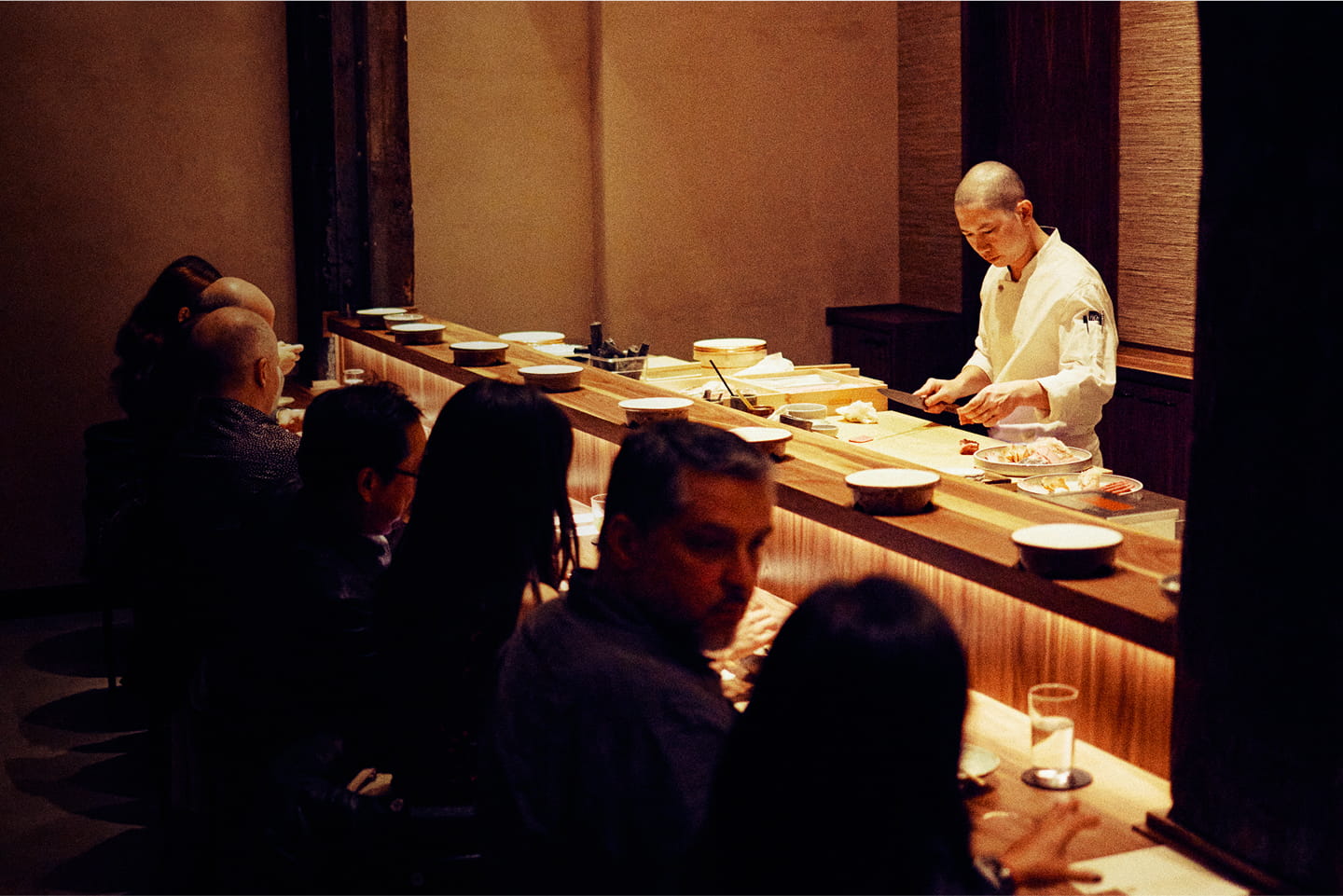 In our omakase room, at a dramatic walnut sushi counter, Chef and Co-Founder Johnny Huang (formerly of Masa) serves a seasonal 11-course sushi omakase menu that features the highest-quality fish and the flavors of broader East Asia.